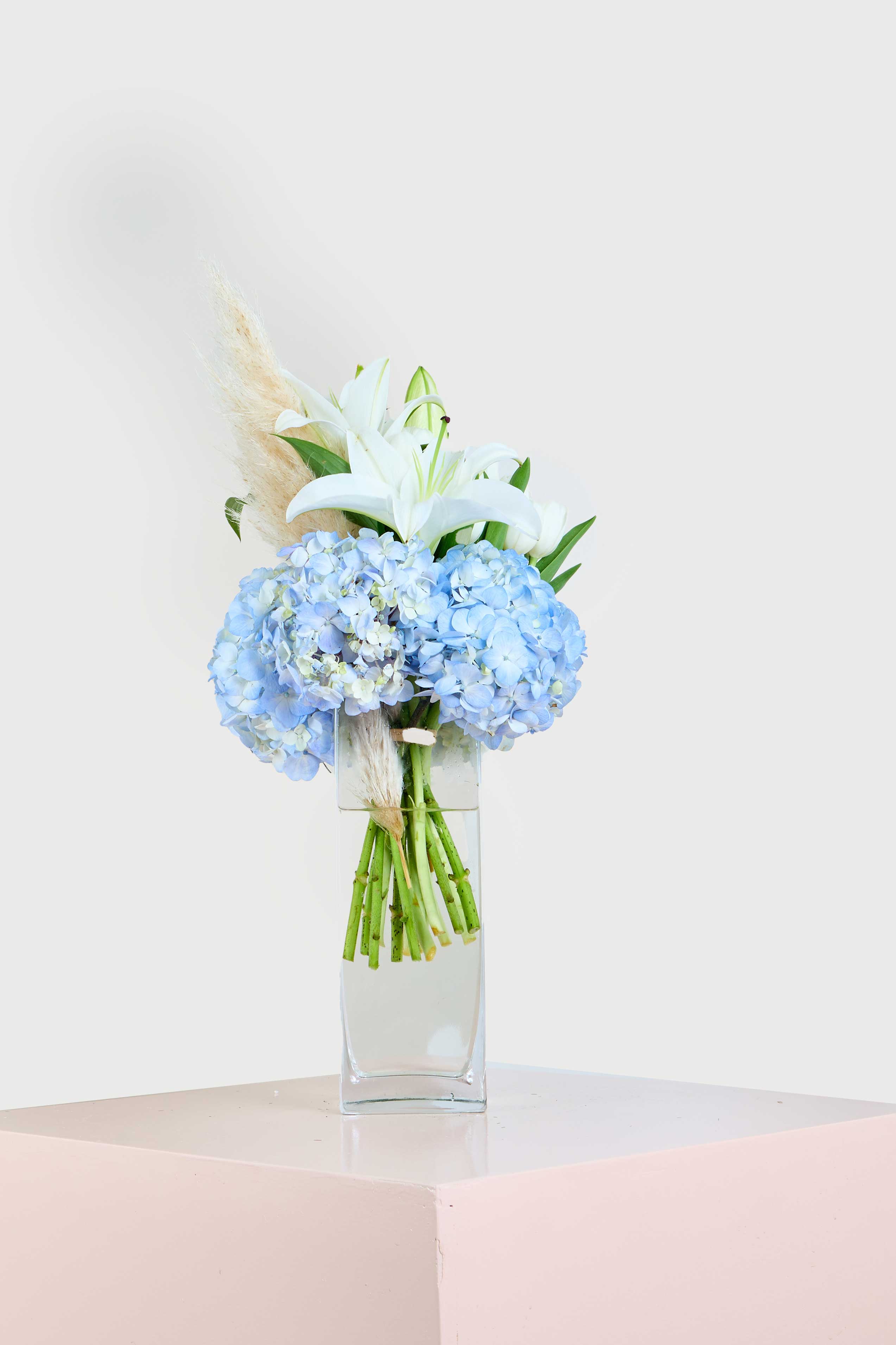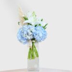 Embrace tranquility with the Blue Serenity bouquet, a stunning combination of serene white lilies and soft blue hydrangeas. The lush white blooms radiate purity and grace, while the light blue hydrangeas bring a refreshing, calming presence. Accentuated by natural pampas grass, this arrangement creates an ethereal balance of elegance and natural beauty.