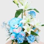 Celebrate the arrival of a precious baby boy with this charming basket arrangement! Featuring pure white lilies and soft blue roses, it’s the perfect gift for newborns or baby showers. Complete with an adorable blue teddy bear, this delightful floral design expresses your love and best wishes beautifully.