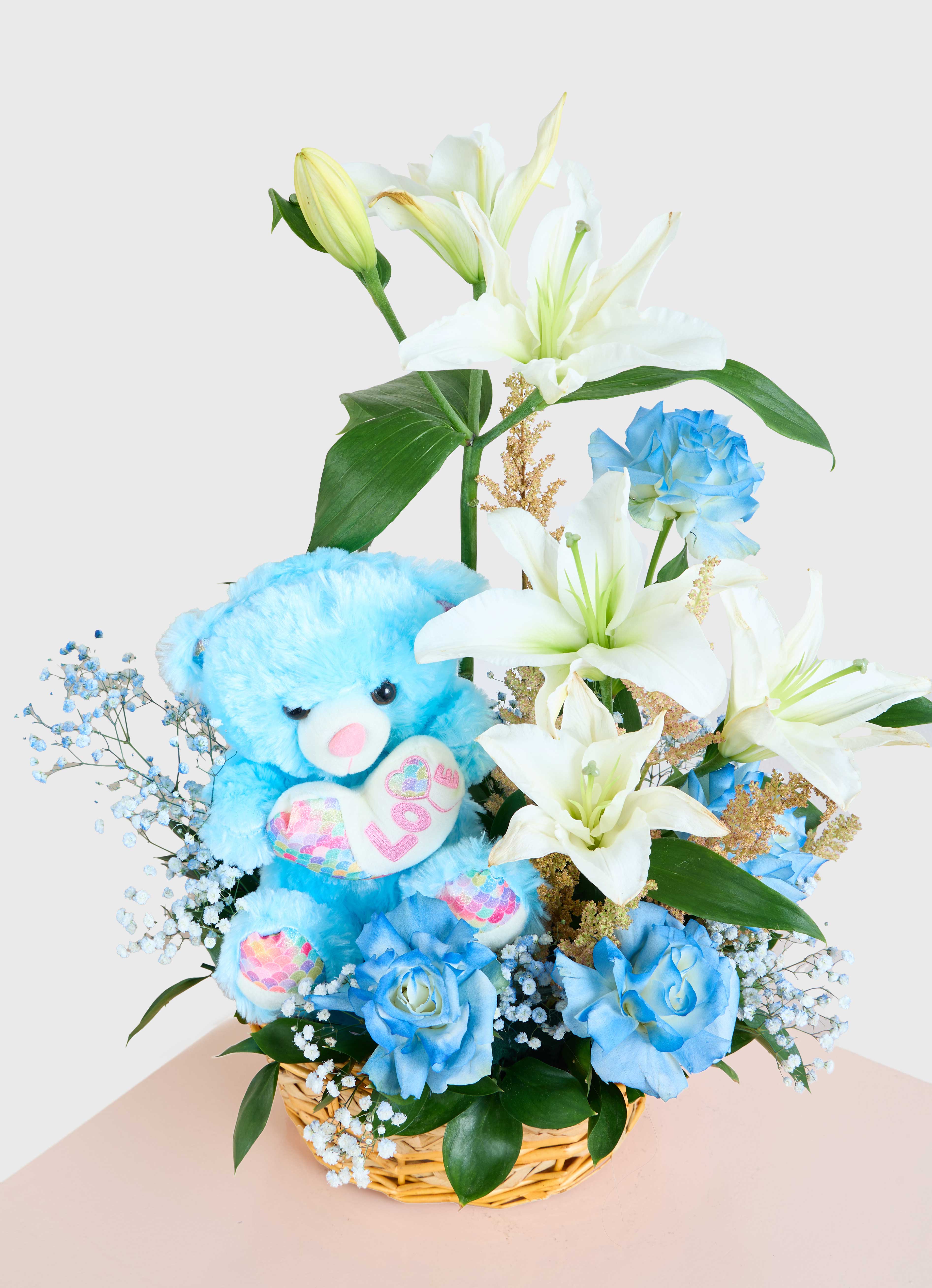 Welcome a new bundle of joy with this charming basket arrangement! Featuring pure white lilies and soft blue roses, this floral design is perfect for celebrating a baby boy's arrival. A cuddly blue teddy bear adds a sweet touch, making it a delightful gift for a newborn or a baby shower. The delicate arrangement of blooms and the adorable plush toy come together to create a heartfelt and memorable gesture, perfect for expressing your love and best wishes to the family.