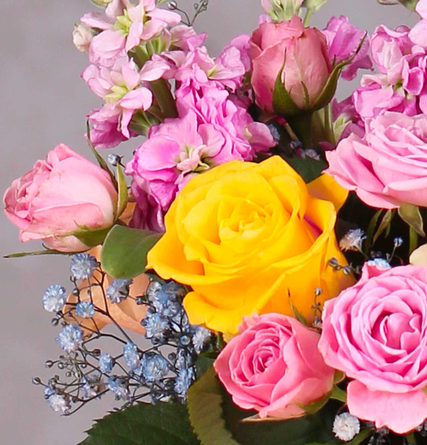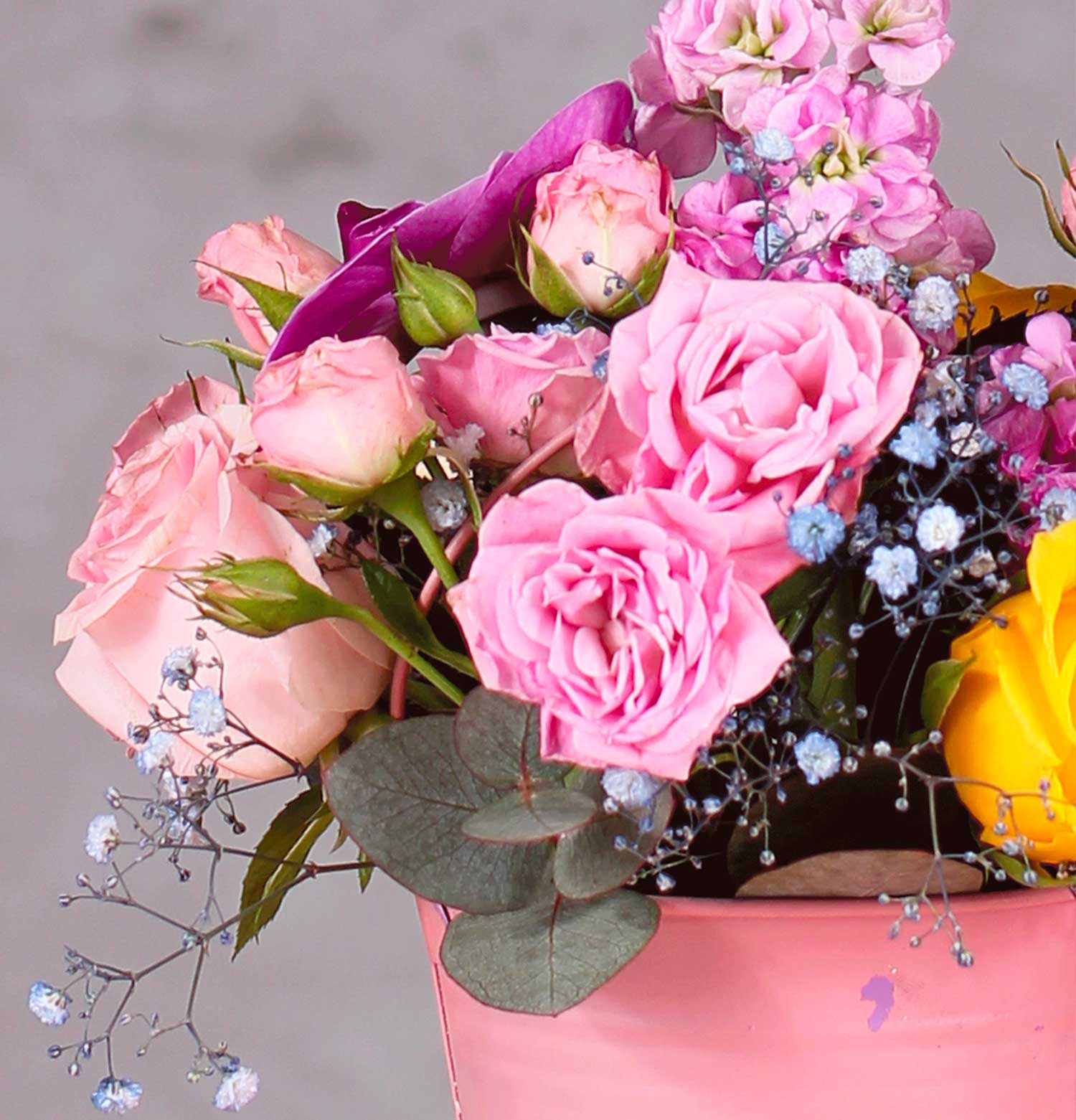 "Chic Hightea Pink Flower Arrangement" presents a vibrant assortment of pink and yellow flowers, artfully arranged in a contemporary pink pot. Its modern and stylish design is perfect for adding a pop of color and cheer to any space, ideal for celebrations or as a fashionable home decor piece.