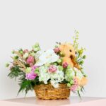 Brighten someone’s day with the “Cuddle and Blooms Flower Basket,” featuring a charming teddy bear and a lovely arrangement of pastel blooms in a woven basket. The soft hues and lush greenery create a joyful display, perfect for welcoming a new baby, celebrating a birthday, or sending warm wishes.