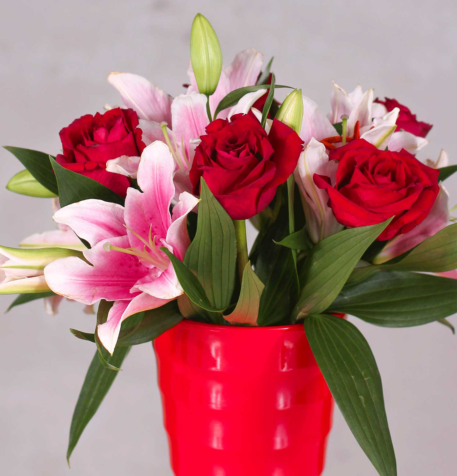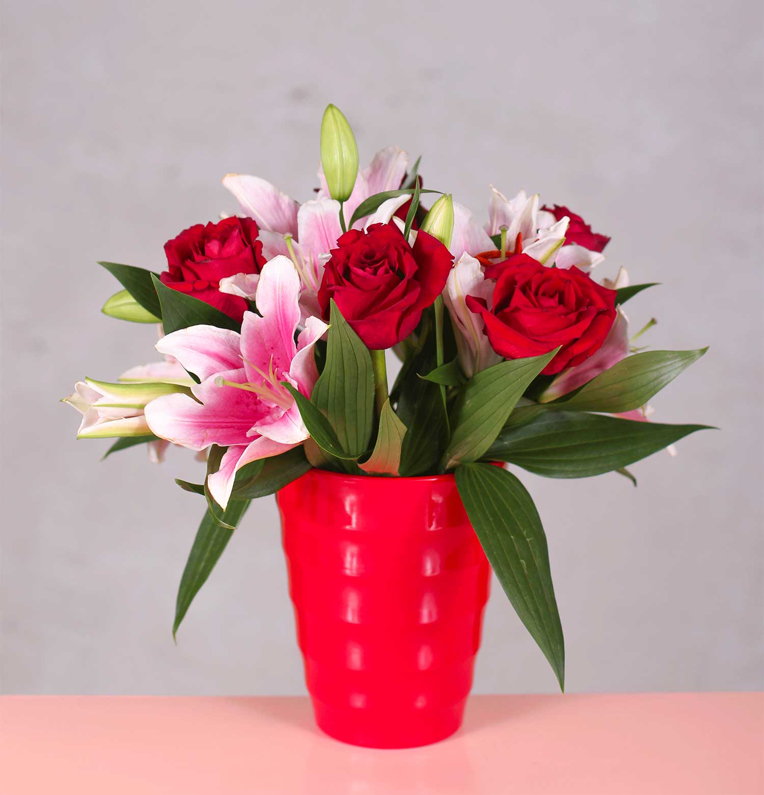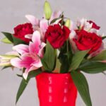 Cherish the moments with the Darling Red Rose Arrangement, a classic yet vibrant selection of deep red roses, accented with the soft touch of pink lilies. Presented in a charming red vase, this bouquet is a heartfelt expression suitable for romantic gestures or special celebrations