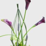 This elegant arrangement, featuring striking deep purple calla lilies, is an ode to modern sophistication. Nestled in vibrant green foliage and accented with unique textures, this floral display exudes both simplicity and luxury. Perfect as a statement piece, it brings a refined, artistic touch to any space. Whether for a special occasion or a stylish gift, this arrangement promises to captivate and impress with its contemporary charm.