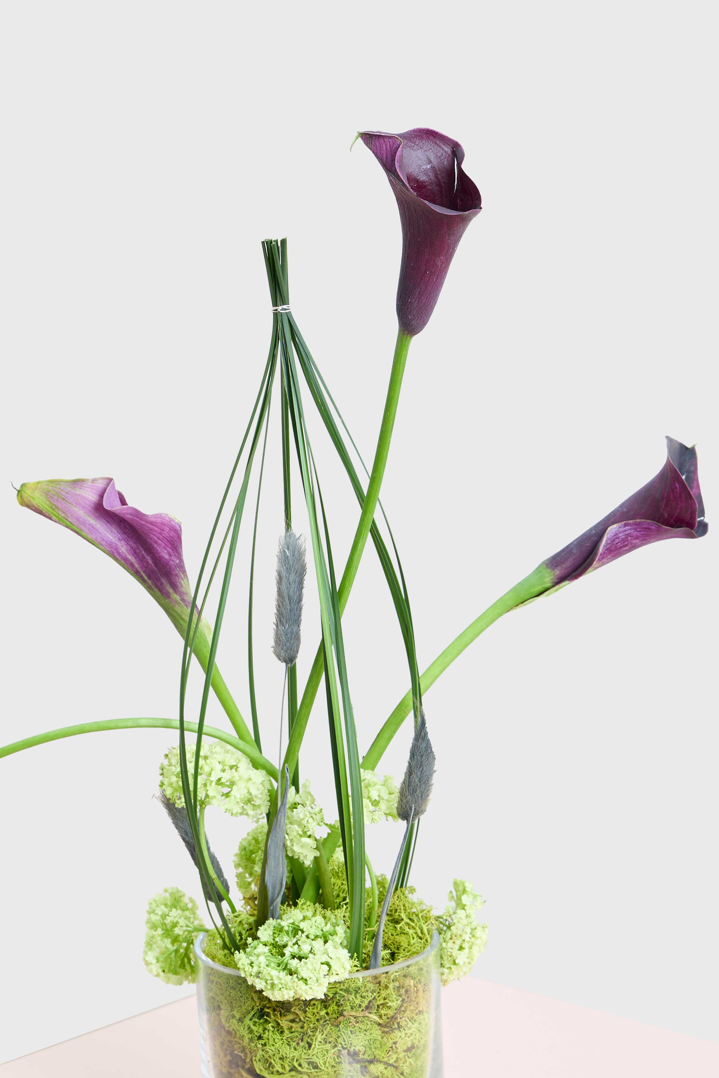 Elevate any space with this stunning arrangement of deep purple calla lilies, complemented by vibrant green foliage and unique textures. Housed in an elegant glass vase, this floral display is the perfect statement piece for any occasion.