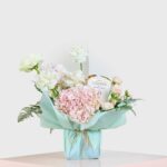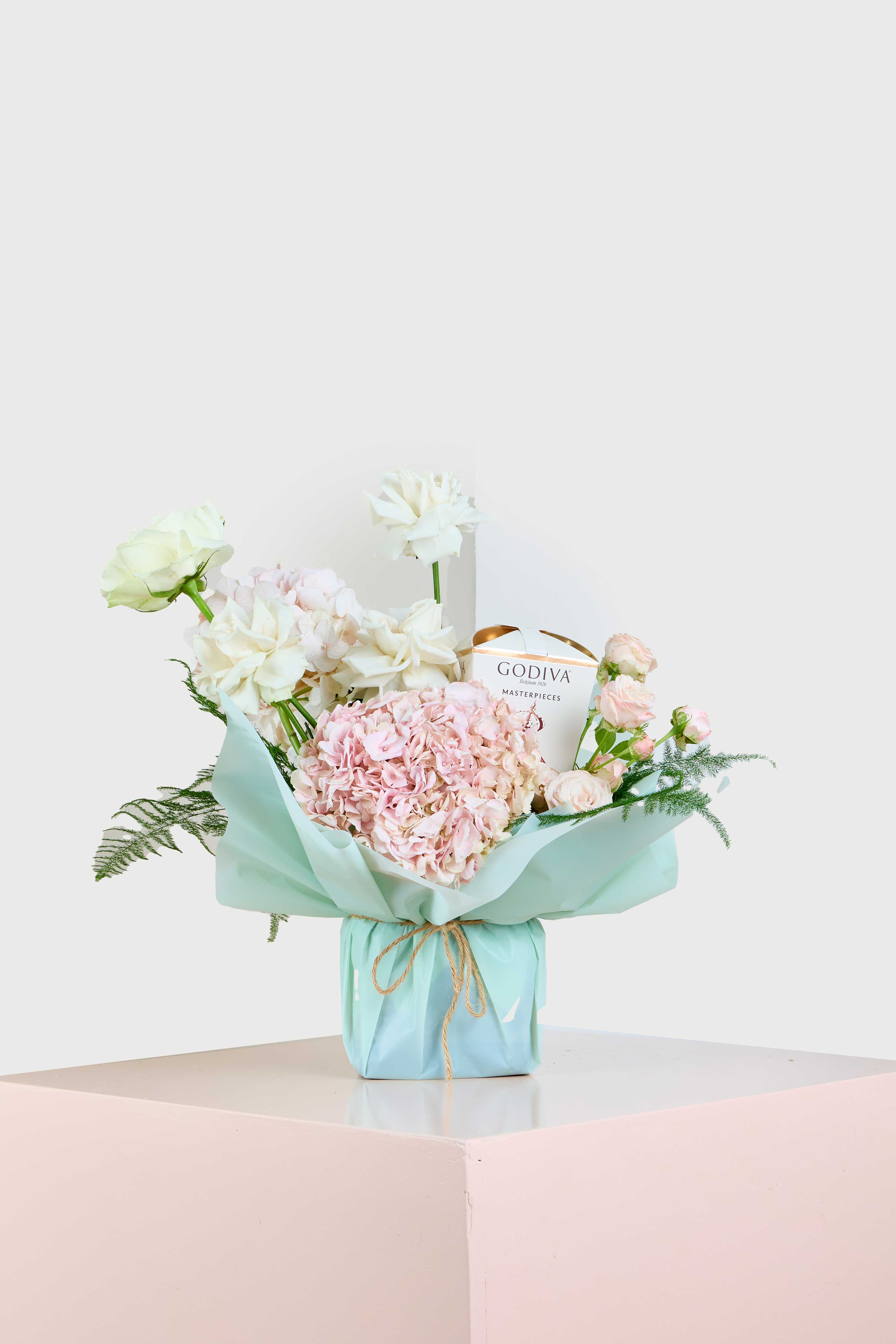 Spoil your loved one with this luxurious bouquet of pastel roses and blooming hydrangeas, paired with decadent Godiva Masterpieces chocolates. Wrapped in mint green with a twine bow, it’s the perfect gift for any special occasion.