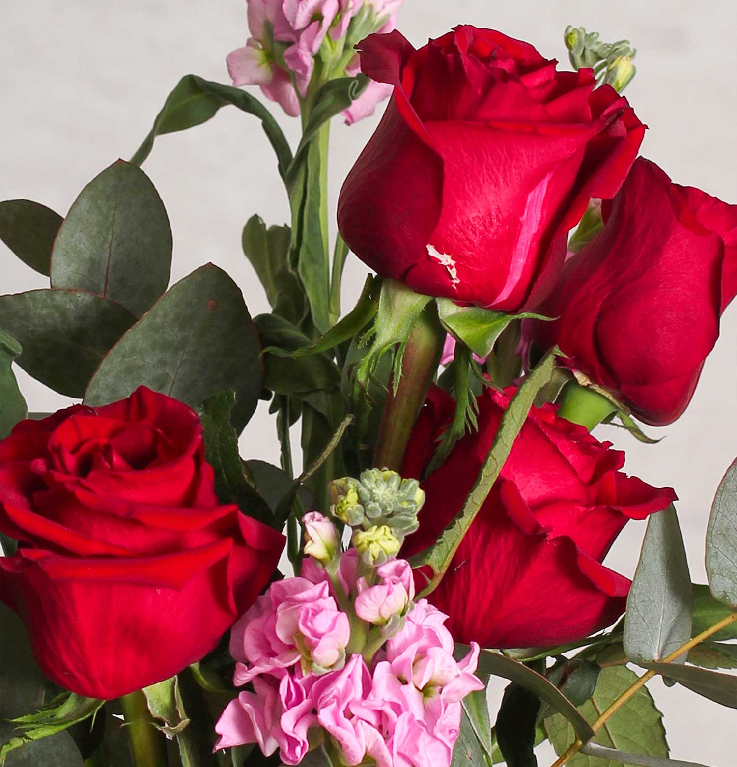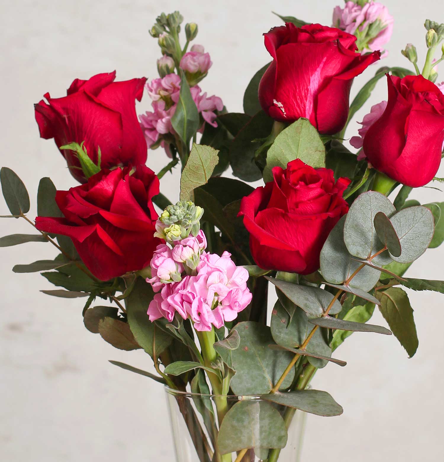 This vase arrangement showcases the timeless beauty of red roses, complemented by delicate pink accents and lush greenery. It's a classic and elegant statement, symbolizing enduring passion and love. Ideal for anniversaries, romantic gestures, or simply to say "I love you."