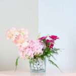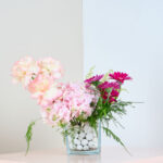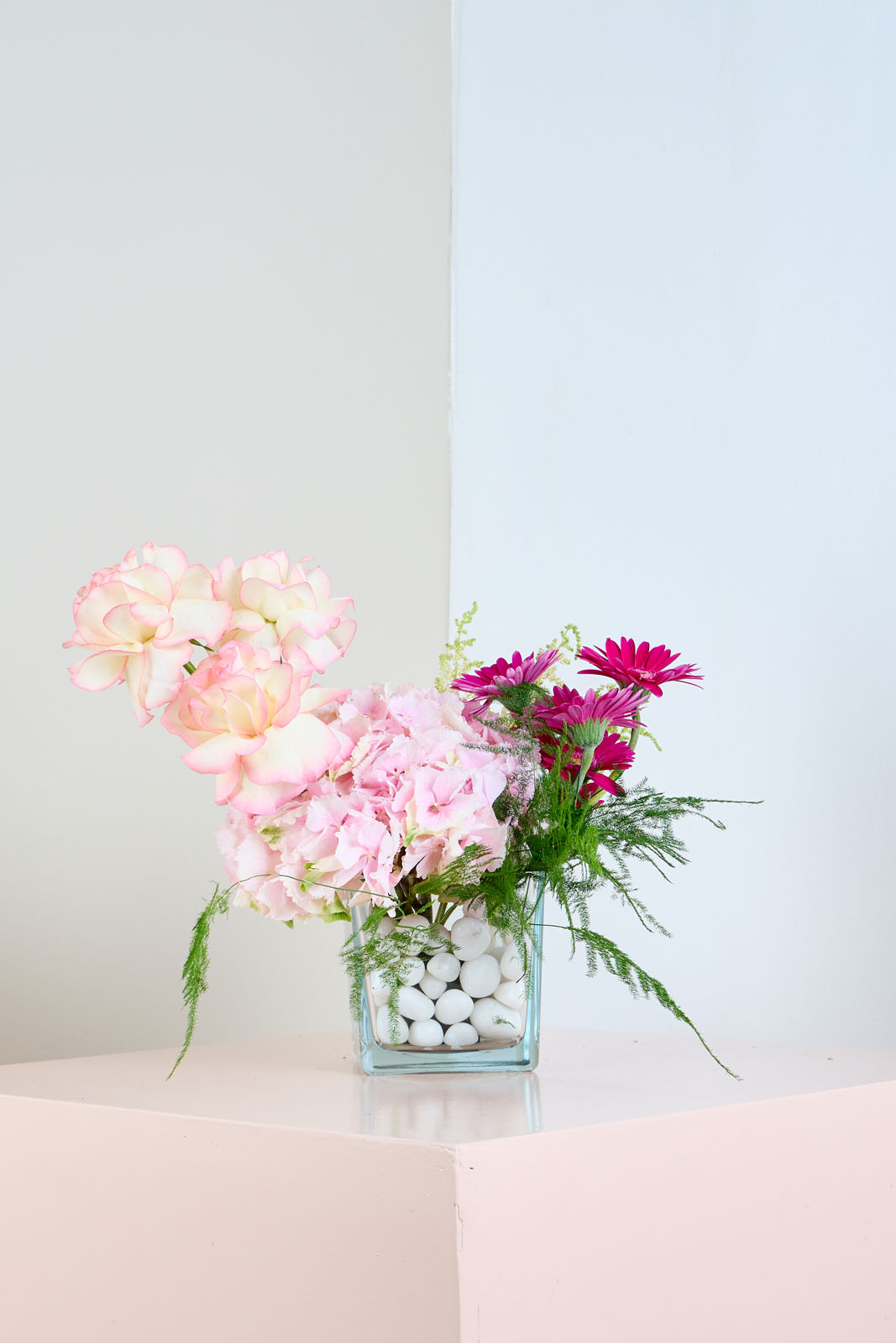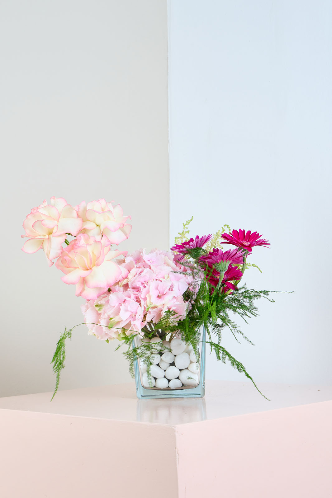 Brighten any room with this cheerful arrangement of soft pink roses, hydrangeas, and vibrant magenta gerbera daisies. Perfect as a gift or to enhance your home with a touch of nature.