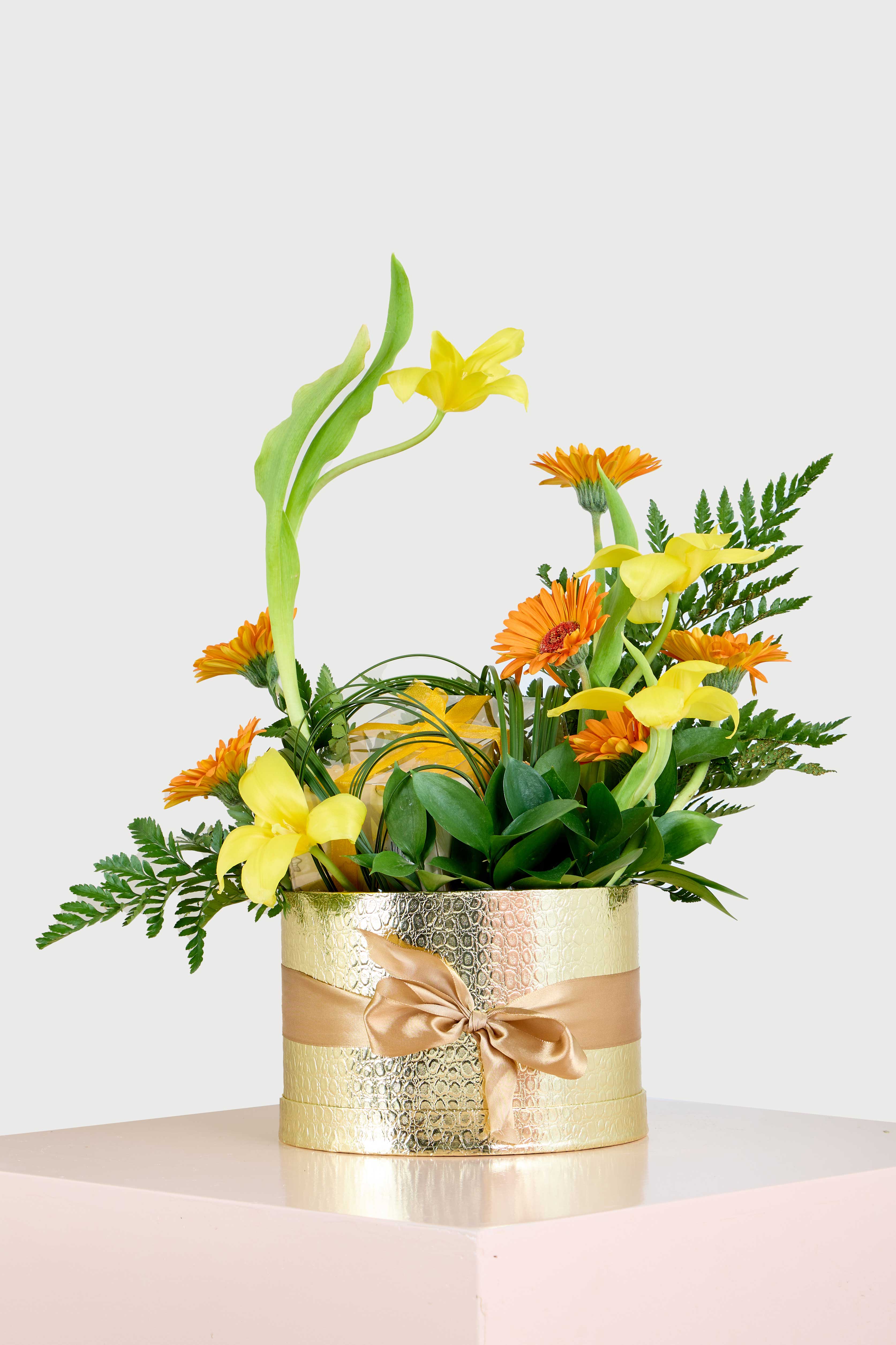 Brighten up any room with this radiant arrangement featuring a delightful mix of sunny yellow tulips and vibrant orange gerbera daisies. Set in a luxurious golden basket with a satin ribbon, this display exudes warmth and joy, making it the perfect gift for celebrations, get-well wishes, or just to spread some happiness.