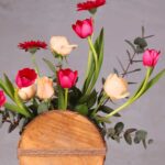 “Juliette’s Red Rose Fantasy” is a harmonious blend of romance and modernity. The spherical wooden vase anchors bold red roses and vibrant pink blossoms, offering a captivating centerpiece. Its balance of wild greenery and structured beauty captures the essence of a modern-day love story.