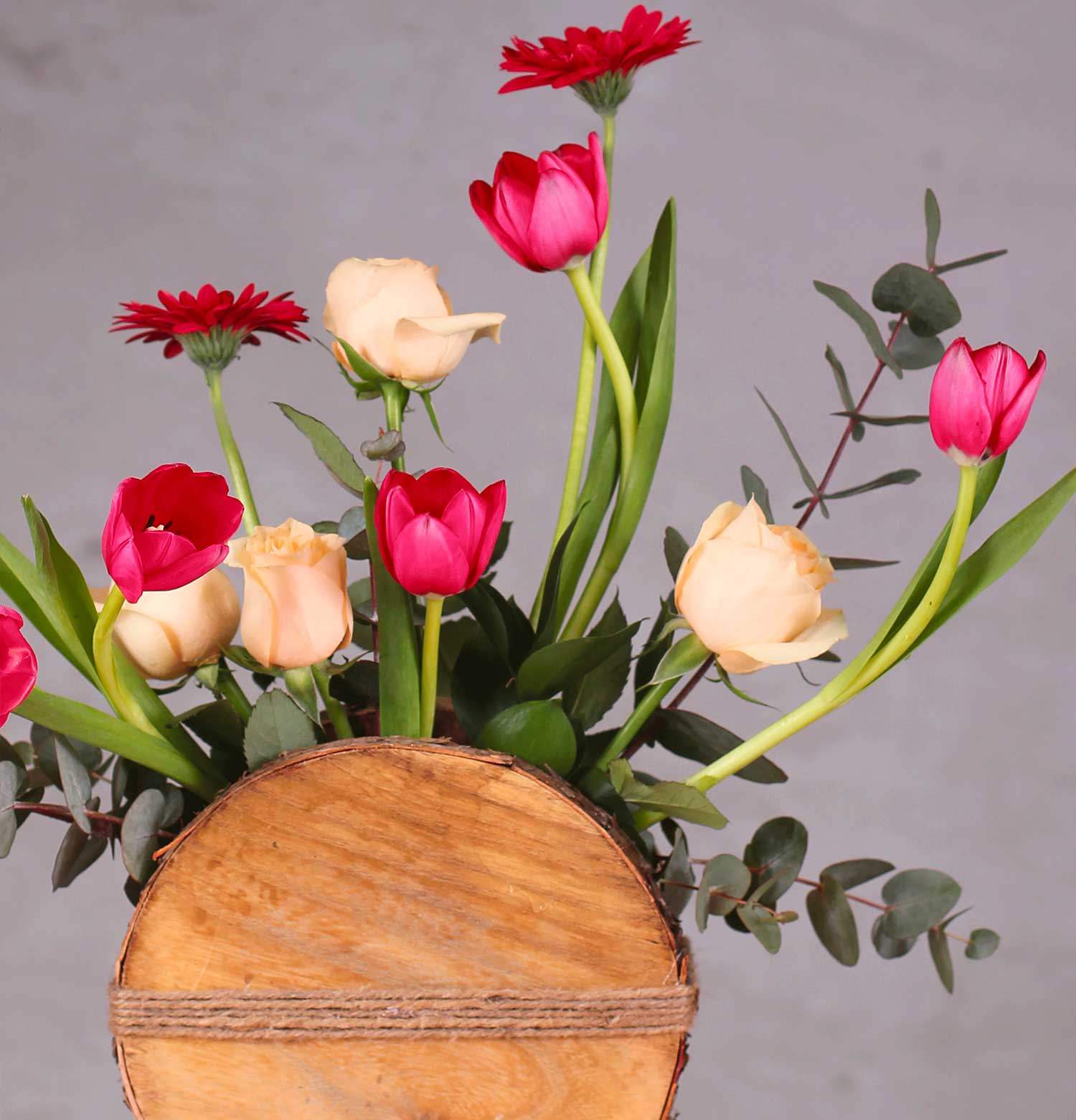 "Juliette's Red Rose Fantasy" is a harmonious blend of romance and modernity. The spherical wooden vase anchors bold red roses and vibrant pink blossoms, offering a captivating centerpiece. Its balance of wild greenery and structured beauty captures the essence of a modern-day love story.