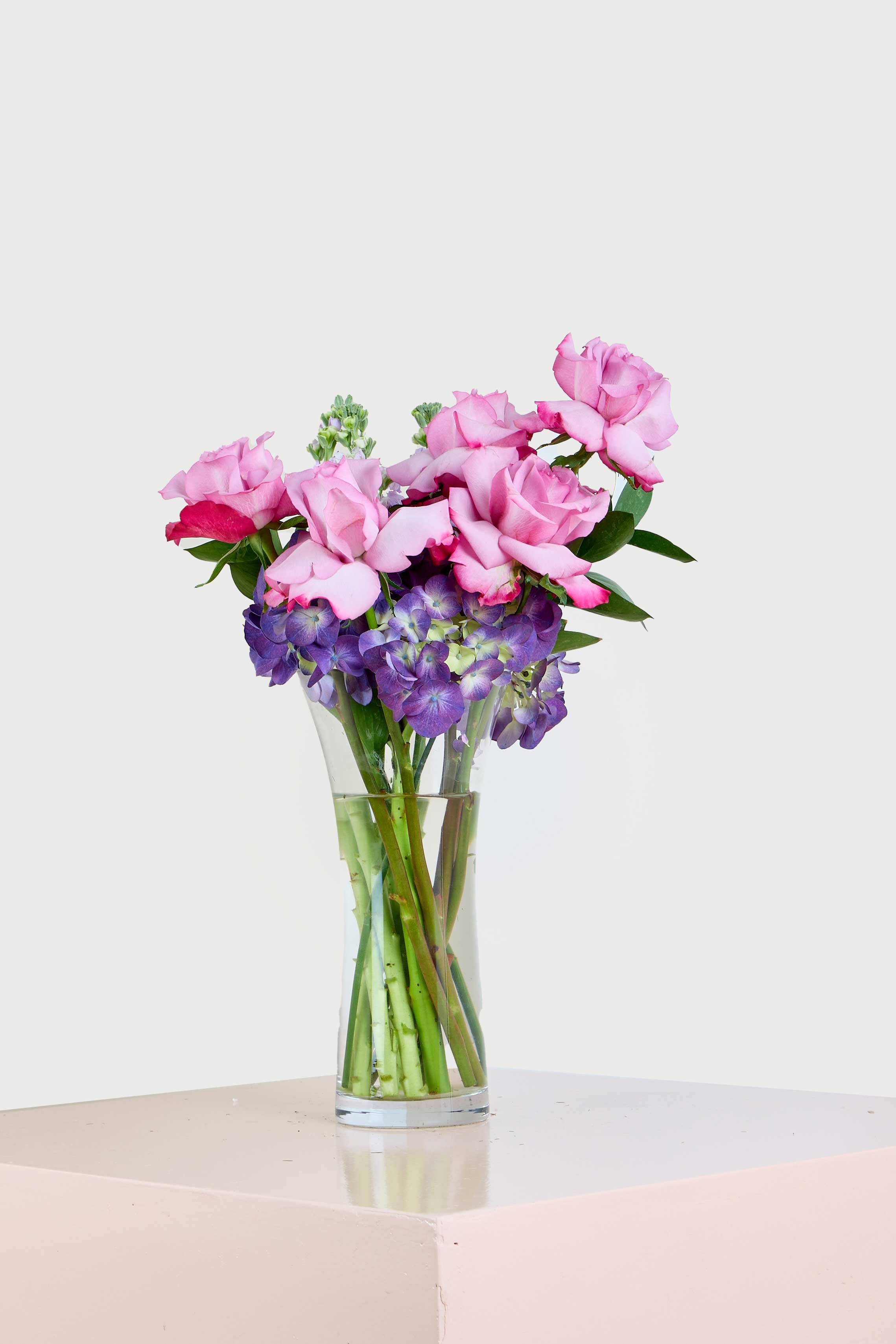 A bouquet that embodies romance and charm, the Lavender Kissed Roses arrangement features soft pink roses kissed with touches of lavender blooms. This graceful blend of blushing roses and delicate violet hydrangeas creates an enchanting display that’s perfect for expressing love, admiration, or heartfelt gratitude. Nestled in a sleek glass vase, the soothing lavender hues bring calmness, while the vibrant pink roses add a burst of romance.