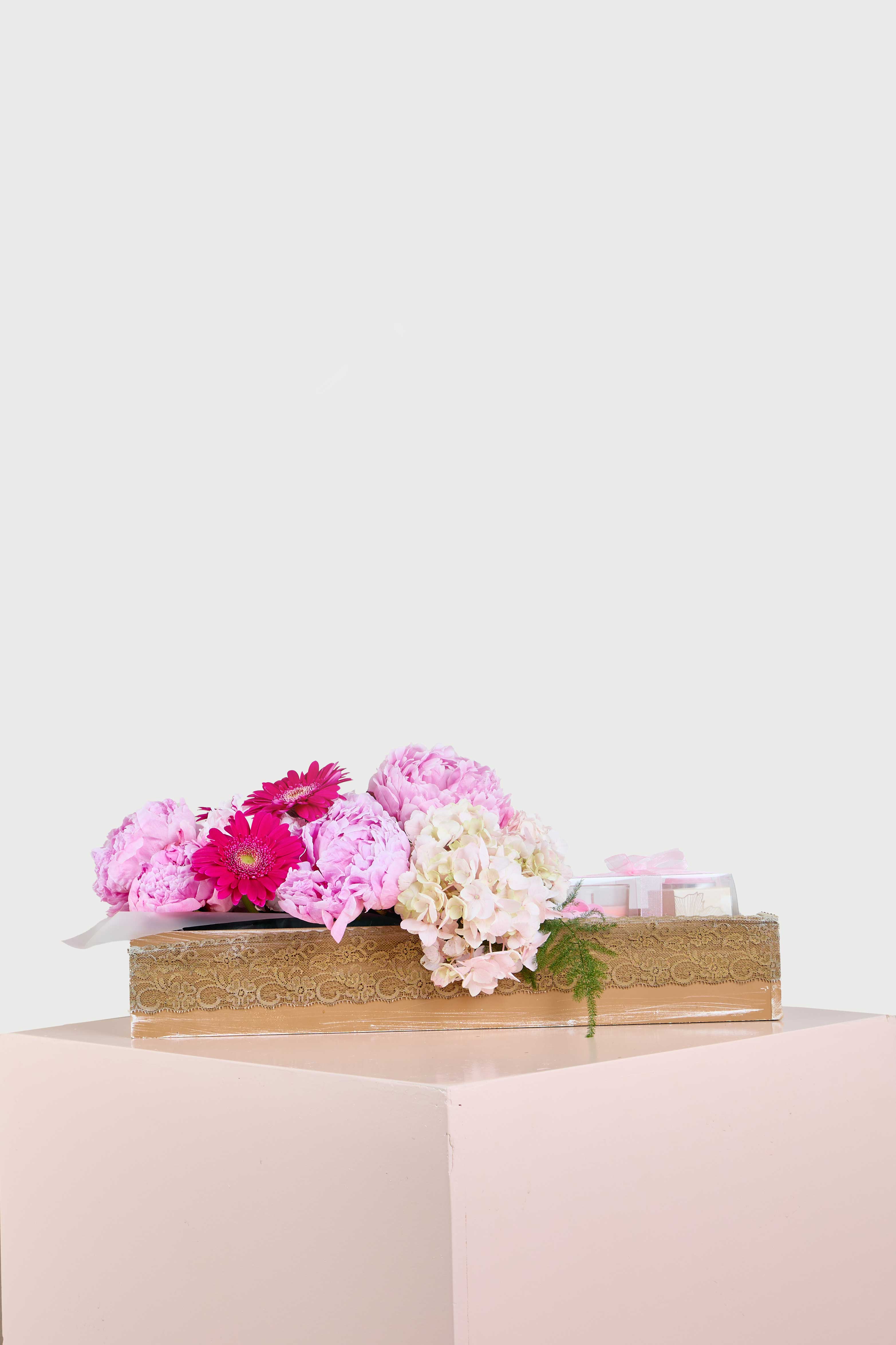 Celebrate every special moment with this elegant pink floral arrangement! Featuring luxurious peonies and bold gerberas, this stunning design is the epitome of feminine charm. Paired with a delightful candle gift set, it’s perfect for pampering someone you love. Whether it’s for a birthday, anniversary, or just to brighten someone’s day, this arrangement will make an unforgettable impression. Let this thoughtful gift spread warmth and joy, leaving a lasting memory.