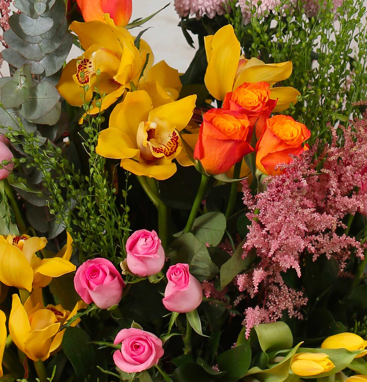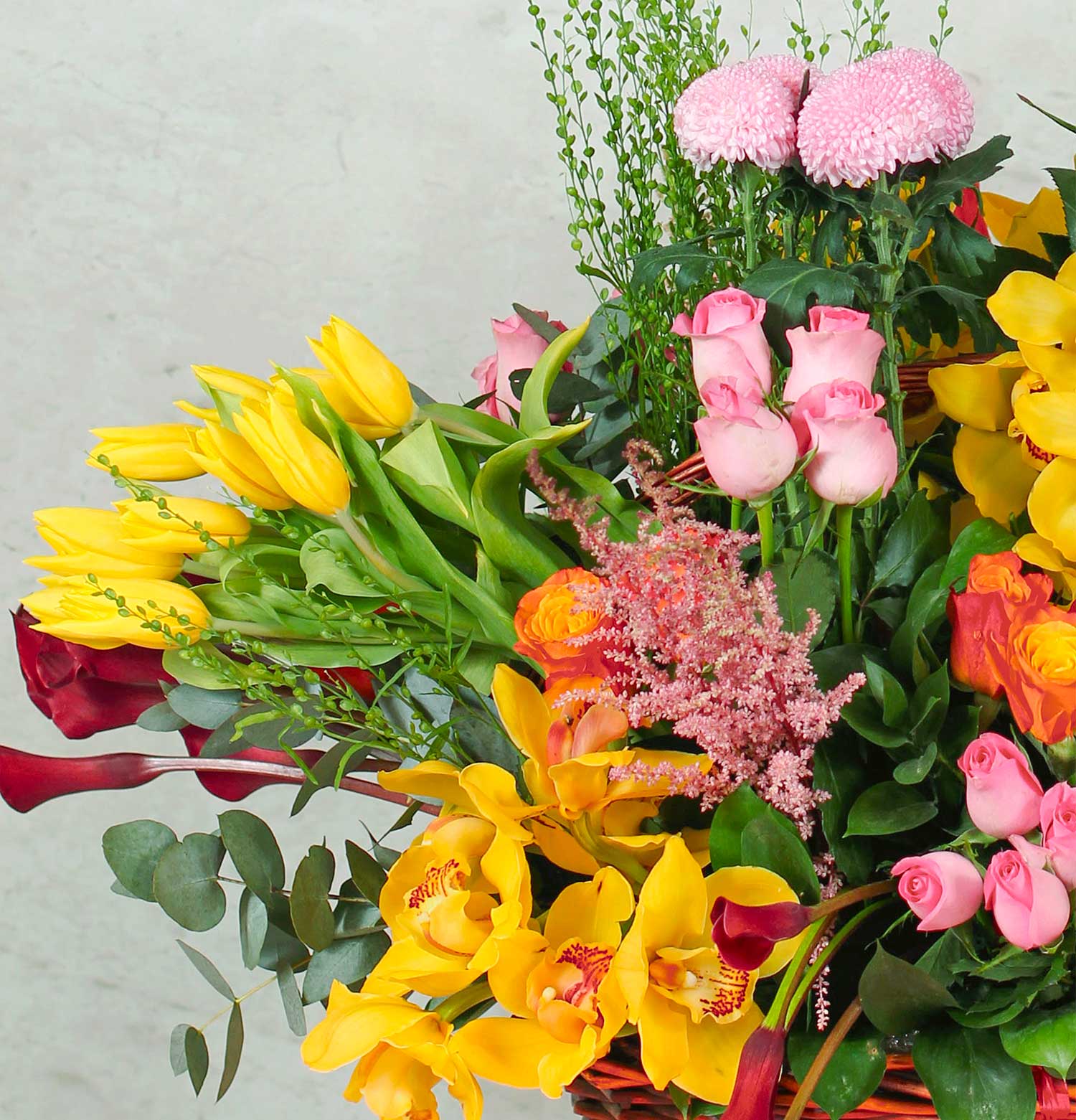The “Pop And Petals Flower Basket” is a lively celebration of color, brimming with bright yellow, pink, and red flowers, complemented by a variety of textures and greens in a traditional wicker basket. It’s a joyful expression for any cheerful occasion.