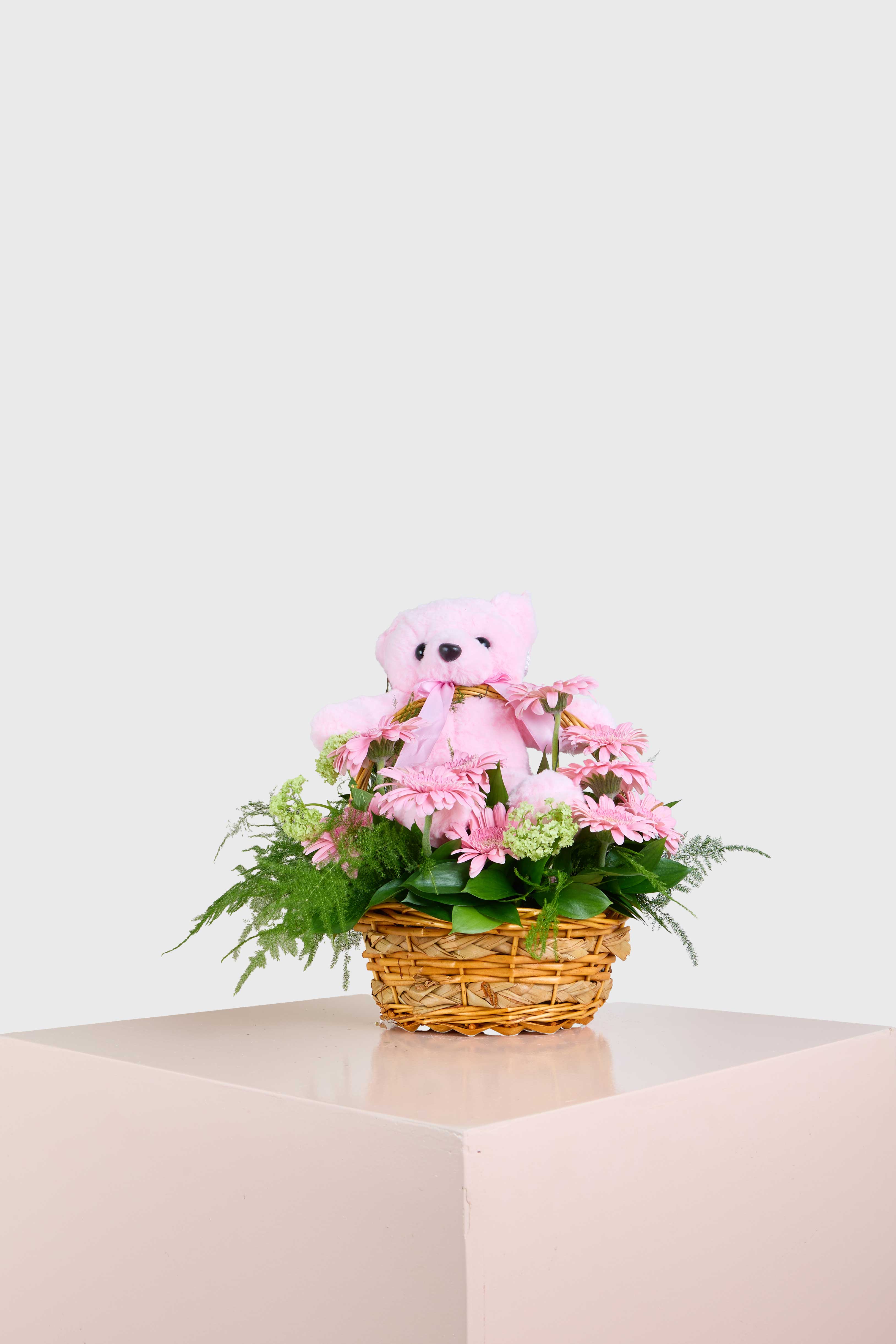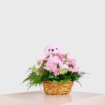Celebrate the arrival of a precious baby girl with this adorable pink-themed basket arrangement. Delicate pink gerberas are beautifully arranged with soft greenery, creating a charming and feminine display. The star of the show is a cuddly pink teddy bear, perfect for gifting to the little one. Whether it's for a baby shower or a special delivery to the hospital, this sweet arrangement is the ideal way to share your joy and send your heartfelt congratulations.