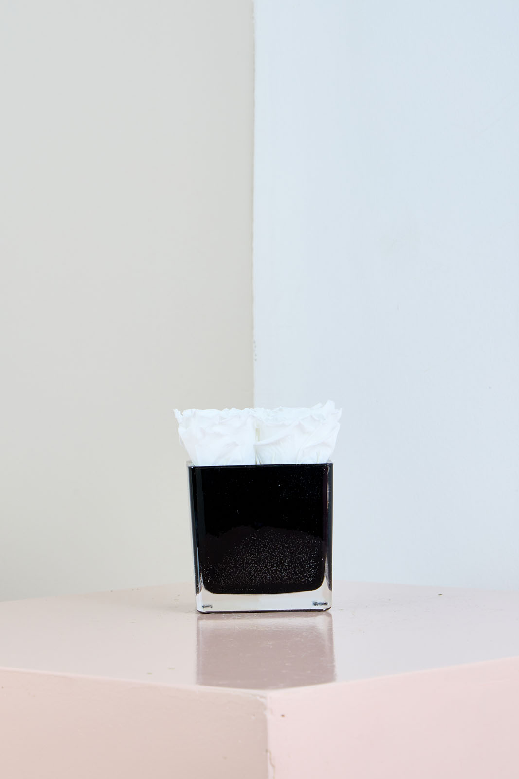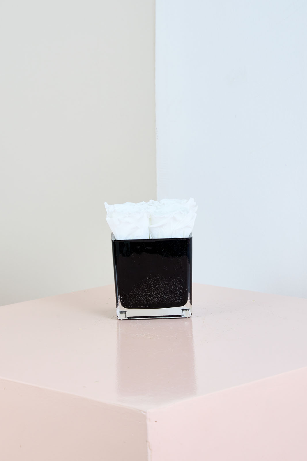 Pure Grace features pristine white preserved roses arranged in a sleek black glass vase, creating a stunning contrast. This minimalist design embodies timeless sophistication, making it ideal for expressing sympathy, celebrating new beginnings, or adding refinement to any space.