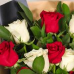 This bouquet is a classic expression of elegance, featuring a balanced blend of red and white roses. Wrapped in contrasting black and soft brown paper with a pink ribbon, it’s a perfect gift for expressing love and admiration on any special occasion.