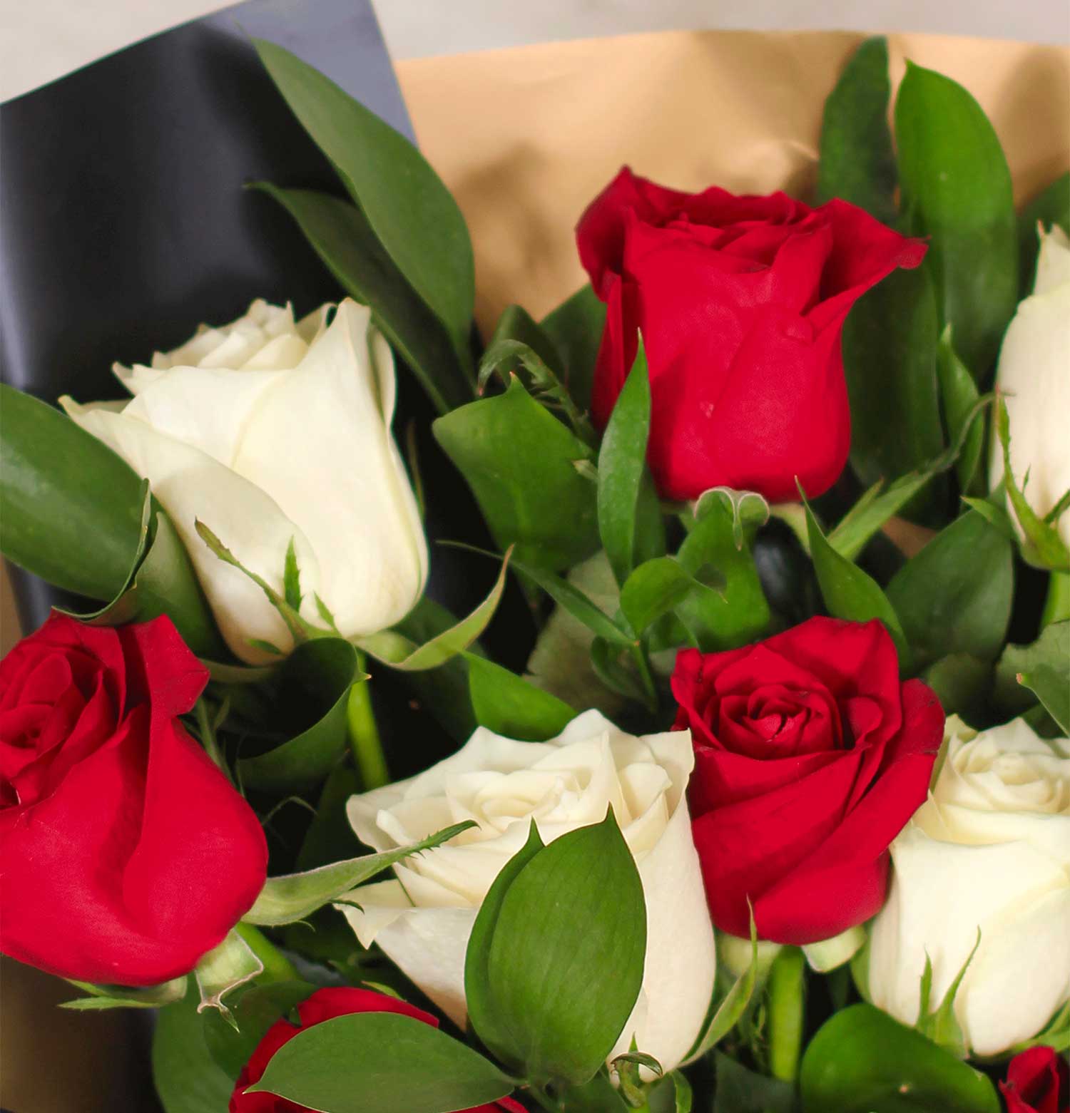 This bouquet is a classic expression of elegance, featuring a balanced blend of red and white roses. Wrapped in contrasting black and soft brown paper with a pink ribbon, it's a perfect gift for expressing love and admiration on any special occasion.