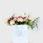 The “Rosy Glow Flower Gift Bag” showcases a stunning blend of pastel blooms in a sleek white bag, exuding elegance and charm. Perfect for any occasion, this graceful arrangement is sure to leave a lasting impression.