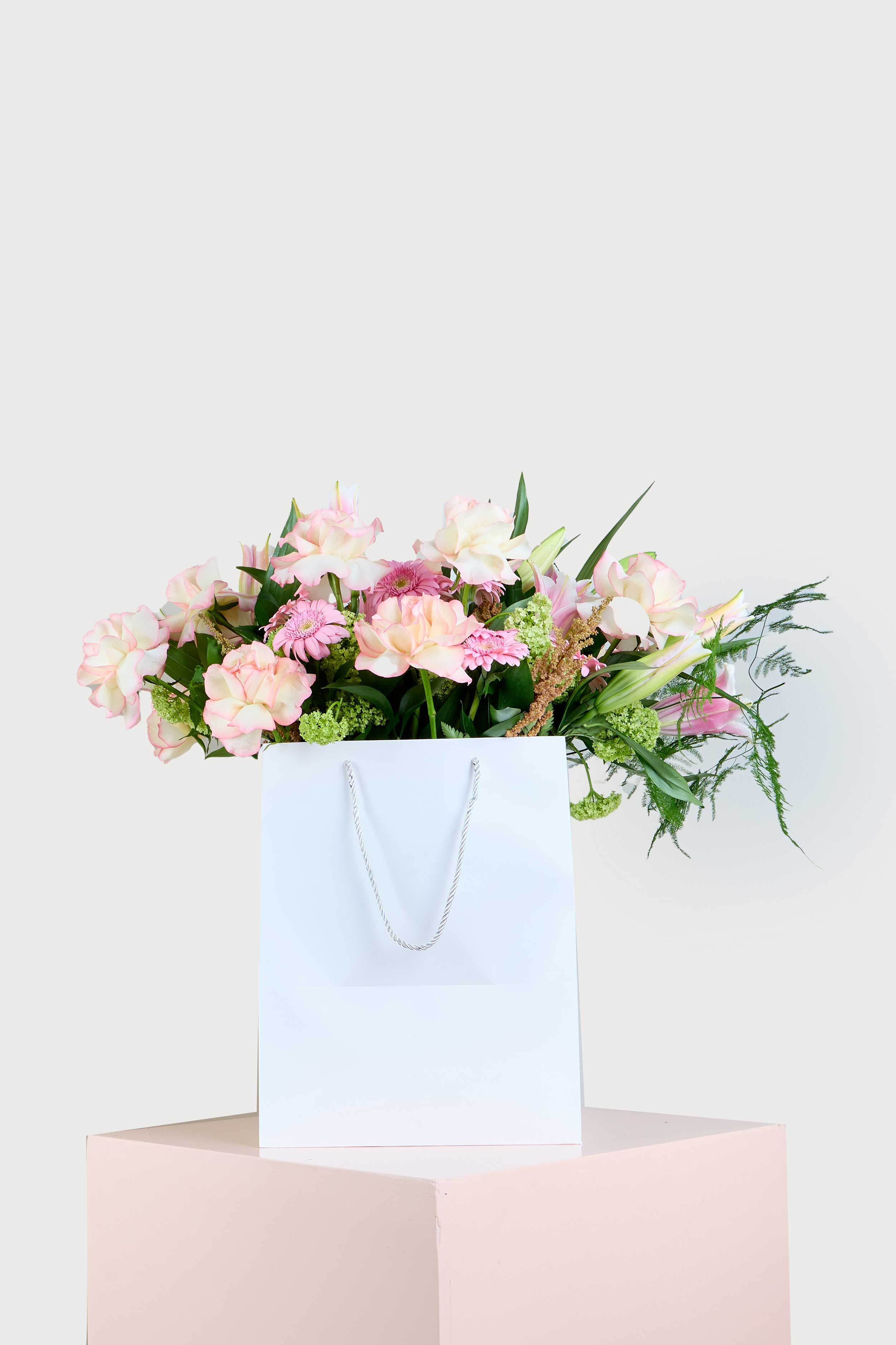 Embrace the soft, romantic glow of blush tones with the "Rosy Glow Flower Gift Bag." This exquisite arrangement features an artful blend of pastel blooms, delicately nestled in a sleek white bag, creating a timeless and elegant presentation. With its harmonious mix of colors and textures, this bouquet radiates charm and sophistication, making it a perfect gift for any occasion. Whether you're celebrating a special moment or simply brightening someone’s day, this beautiful gift bag of fresh blooms will leave a lasting impression.
