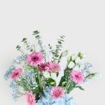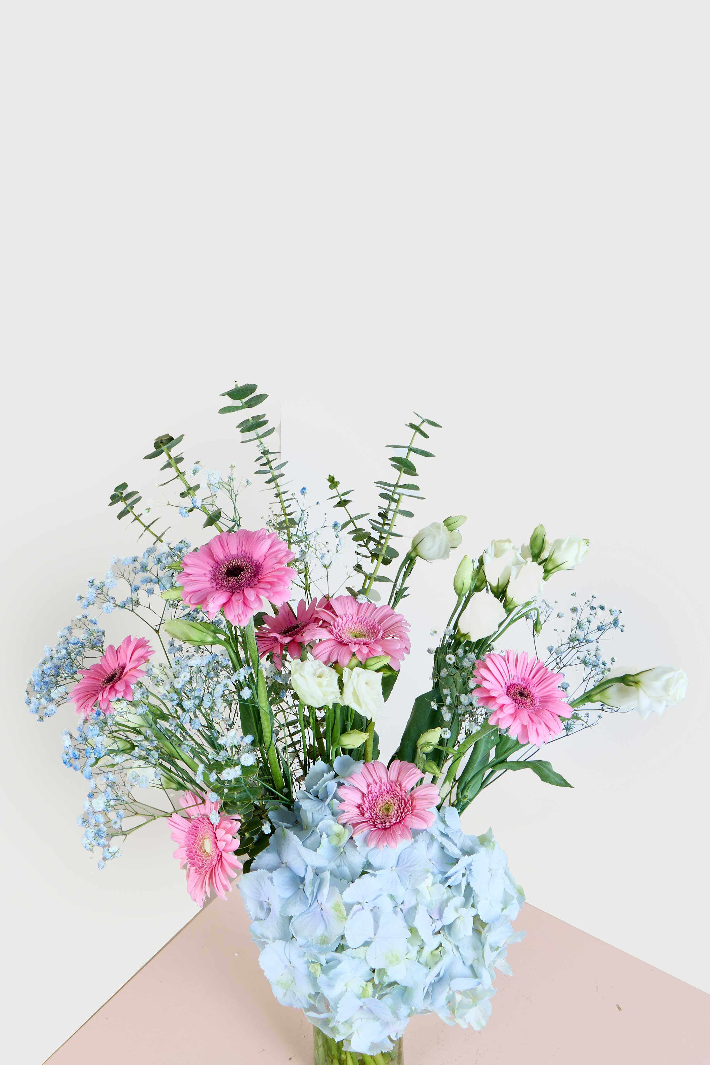 Embrace the softness of pastel tones with this dreamy bouquet, featuring delicate pink Gerberas, creamy white Roses, Lisianthus, and soft blue Hydrangeas. Wrapped in chic pastel paper, it’s a timeless and sophisticated choice for special occasions or simply to show someone they’re loved.