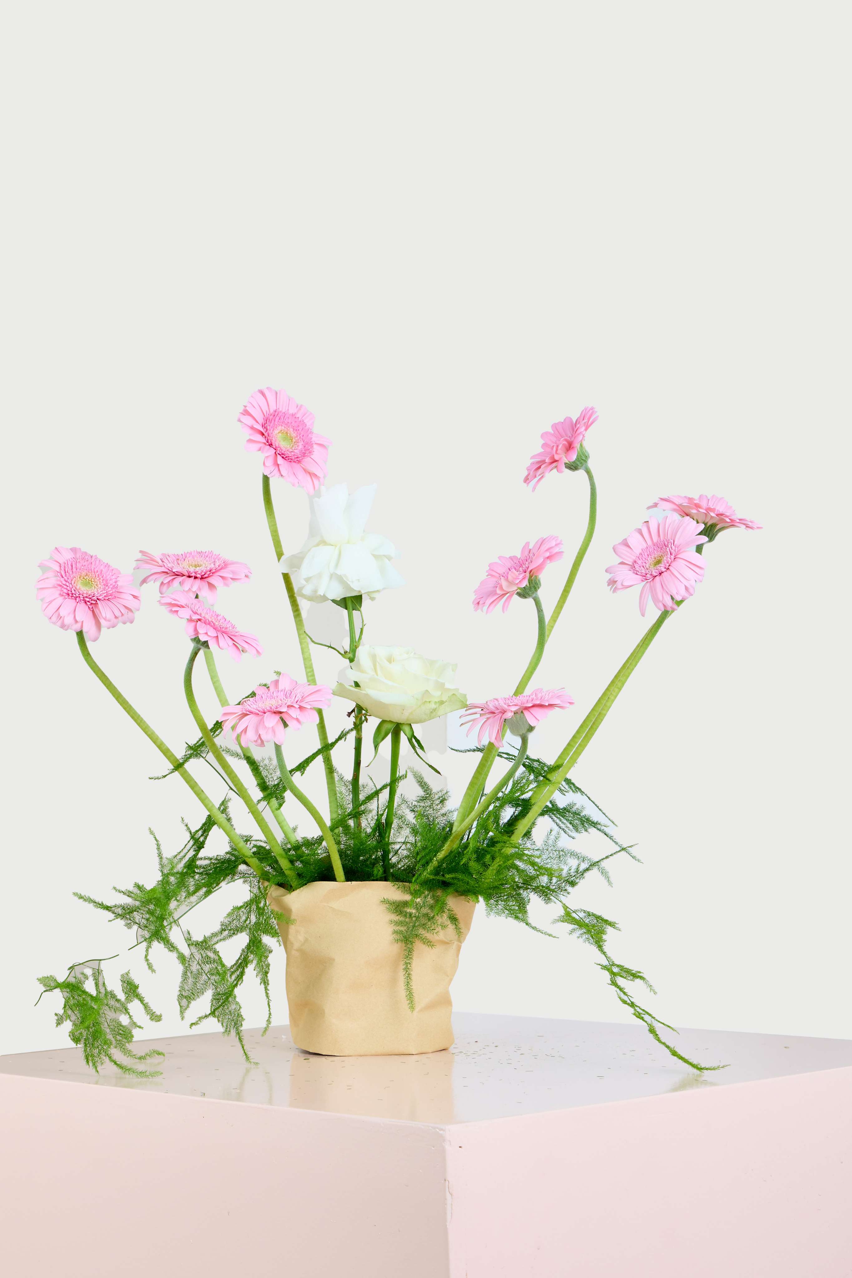 Soft pink gerberas and delicate white roses dance gracefully in this elegant arrangement, set against lush green Asparagus leaves. Ideal for any occasion, it exudes serene charm and natural beauty, making it perfect for home decor or gifting.